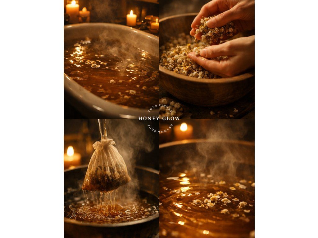 Honey Glow je koupel v louce zalité sluncem. Jemná bylinná vůně heřmánku a květin se rozplývá ve vodě zbarvené do teplého odstínu karamelového medu. Zemitý hojicha čaj uzemňuje a přináší klid, zatímco moringa a gotu kola podporují vnitřní rovnováhu a lehkost. Slunečnicové a měsíčkové okvětní lístky se ve vodě odrážejí jako zlaté paprsky, zatímco jemné ovesné vločky s mořskou solí hýčkají pokožku.